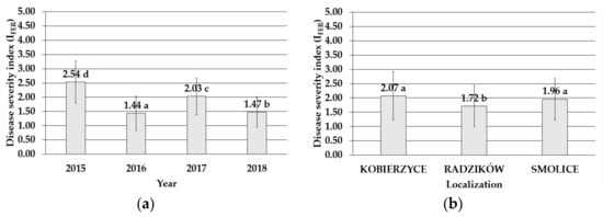 Mean value with standard deviation bars of the disease severity index of maize genotypes inoculated with Fusarium temperatum in the field test (a) during the four cropping seasons (2015–2018) and (b) during the four cropping seasons (2015–2018) in Smolice, Radzików, and Kobierzyce. The average values obtained within an individual cropping season for all genotypes of maize marked with the same letter do not differ significantly at p ≤ 0.05. The average values obtained for an individual localization over the all years of study marked with the same letter do not differ significantly at p ≤ 0.05.