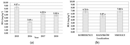 Mean BEA content with standard deviation bars in maize genotypes inoculated with Fusarium temperatum in the field test (a) during the four cropping seasons (2015–2018) and (b) during the four cropping seasons (2015–2018) in Smolice, Radzików, and Kobierzyce. The average values obtained within an individual cropping season for all genotypes of maize marked with the same letter do not differ significantly at p ≤ 0.05. The average values obtained for an individual localization over the all years of study marked with the same letter do not differ significantly at p ≤ 0.05.