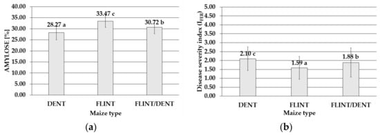 Mean with standard deviation bars (a) amylose content in the dent, flint, and flint/dent maize types in the field test during the four cropping seasons (2015–2018); (b) value of the disease severity index of the dent, flint, and flint/dent maize types inoculated with Fusarium temperatum in the field test during the four cropping seasons (2015–2018). The average values obtained within amylose content in the dent, flint, and flint/dent maize types marked with the same letter do not differ significantly at p ≤ 0.05. The average values obtained for the disease severity index of the dent, flint, and flint/dent maize types marked with the same letter do not differ significantly at p ≤ 0.05.