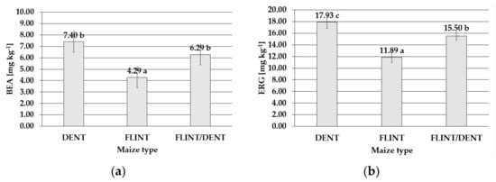 The level of BEA was also maize-type dependent and reflected the IFER severity. The lowest mean level of this metabolite was found in the flint maize (4.29 mg kg−1), and significantly higher content was detected in the dent maize type (7.40 mg kg−1) (Figure 4). Of the three examined maize subpopulations, the significantly highest ergosterol concentration was found in the dent kernels (17.93 mg kg−1). Lower content was detected in the flint/dent maize (15.50 mg kg−1), and the lowest level was determined in the flint type (11.89 mg kg−1) (Figure 4).