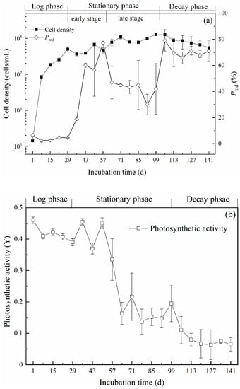 Cell density, percentage of membrane-damaged cells (Pmd) (a), and photosynthetic activity (b) of Microcystis aeruginosa cells during incubation.