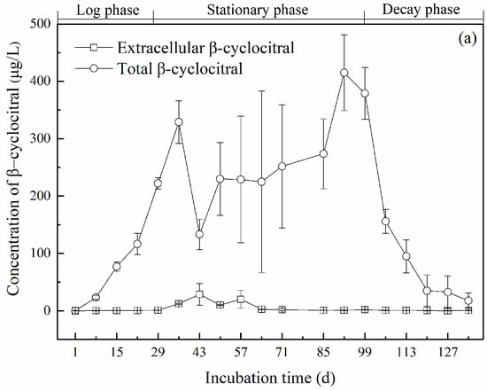 The concentration of β-cyclocitral during the incubation time is shown in Figure 2. In the logarithmic period, the total β-cyclocitral concentration increased rapidly, from the initial value of 0.41 μg/L to 222 μg/L on the 29th day (Figure 2a). The total β-cyclocitral concentration fluctuated greatly in the early stage of the stationary period, in which it reached the peak value of 329 μg/L on the 36th day and then sharply decreased to 133 μg/L on the 43rd day. During the late stage of the stationary period, the total β-cyclocitral concentration increased gradually with the growth rate (Supplementary Figure S1), reaching the maximum value of 415 μg/L on the 92nd day. While entering the decay period, the total β-cyclocitral concentration decreased rapidly, and the lowest concentration of 13.12 μg/L was observed on day 141.