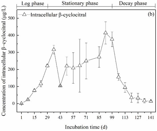 Concentration of β-cyclocitral produced by Microcystis aeruginosa cells during incubation: (a) total and extracellular concentrations of β-cyclocitral, (b) intracellular concentrations of β-cyclocitral.