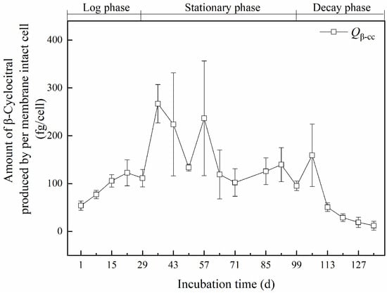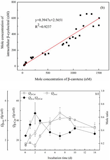 The yield quotas of β-cyclocitral (Qβ-cc) and β-carotene (Qβ-Car) were calculated by applying the Equations (2) and (3), respectively given in Section 5.6, as shown in Figure 4c. Although both Qβ-Car and Qβ-cc increased within the first several days, variations were unsynchronized. Qβ-Car was low and stable within the first 2 days. Starting on day 3, Qβ-Car rose rapidly, reached the maximum of 47.6 fg/cell on day 7, and then gradually decreased to 33.1 fg/cell on the 14th day. In contrast, Qβ-cc increased rapidly from 1.5 fg/cell to 3.7 fg/cell within 3 days. Then, the rise became slow from day 3 to day 9, and the value finally reached the maximum of 4.3 fg/cell on day 9. Qβ-cc then decreased to 3.3 fg/cell on day 14.