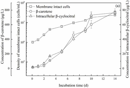 In order to investigate the relationship between β-cyclocitral and its precursor β-carotene, a 14-day experiment with daily sampling was carried out, and the results are shown in Figure 4. Cell density and Pmd were measured during the 14 days of incubation, and the density of membrane-intact cells was calculated.