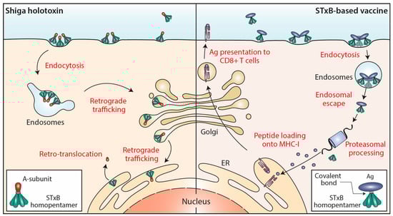 From early endosomes, STxB is delivered by retrograde transport to the endoplasmic reticulum, via the Golgi apparatus (reviewed in [22,23,24]) (Figure 1). From there, the catalytic A-subunit is translocated to the cytosol using the cellular retrotranslocation machinery [25].