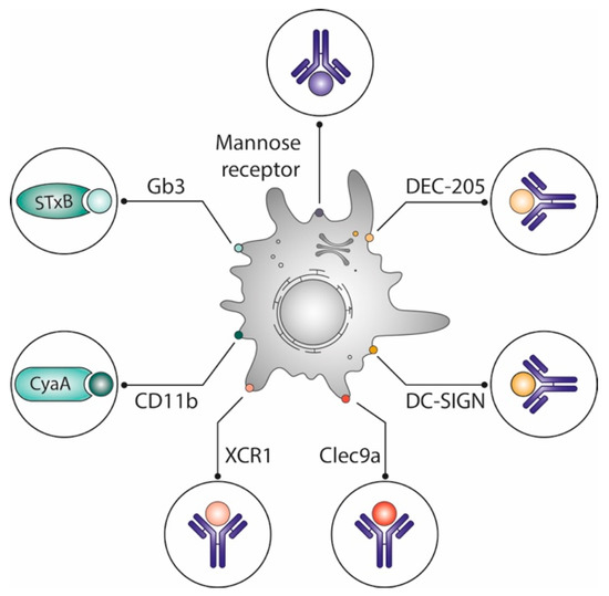 Optimization of vaccines by delivering antigens to dendritic cells. Different vaccine delivery systems preferentially target antigens to dendritic cells, which are known for their capacity to prime naive T cells: Vectors derived from toxin subunits such as the non-toxic STxB, which binds to the glycosphingolipid Gb3, or adenylate cyclase A, which binds to CD11b; antibodies targeting lectins (DEC-205, DC Sign) or other surface markers (mannose receptor, XCR1, Clec9a) of which some are specifically expressed on DC subpopulations. See text for details.