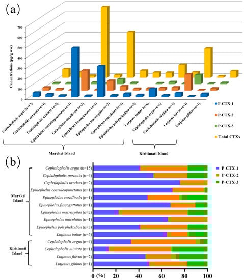 (a) Mean concentrations of P-CTX-1, -2, -3 and total CTXs, and (b) composition profiles of groupers and snappers with detectable CTX levels from Marakei Island and Kiritimati Island.