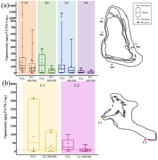 The ciguatoxicities of fish samples in Marakei Island determined by LC-MS/MS and N2a can be shown in Figure 2a. Fish samples collected from sampling site M1 were significantly more toxic than those from M4 (p < 0.05, Mann—Whitney U test). The average ciguatoxicity of fish samples determined by LC-MS/MS in Marakei Island ranked from high to low was M1(86.9 pg/g P-CTX-1 eq.), M3(62.3 pg/g P-CTX-1 eq.), M2 (24.3 pg/g P-CTX-1 eq.), and M4 (9.00 pg/g P-CTX-1 eq.), respectively. The results for N2a were in the order of site M1 (256 pg/g P-CTX-1 eq.), site M3 (175 pg/g P-CTX-1 eq.), site M2 (141 pg/g P-CTX-1 eq.), and site M4 (27.6 pg/g P-CTX-1 eq.). Based on the safety threshold of 10 pg/g P-CTX-1 equivalents, 90.5%, 55.6%, 70%, and 42.9% of fish specimens determined by LC-MS/MS were ciguatoxic within areas M1, M2, M3, and M4, respectively, while 100%, 77.8%, 70% and 57.1% of fish at site M1, M2, M3 and M4 by N2a were found to be unsafe, respectively.