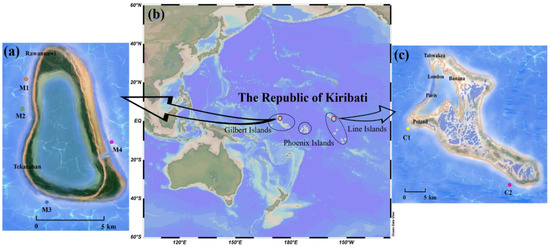 (a) Location of the sampling sites of Marakei Islands; (b) location of the Republic of Kiribati; (c) location of the sampling sites of Kiritimati Islands.