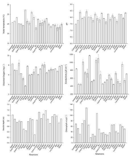 The pH values registered in all the study reservoirs were slightly alkaline, ranging from 7.49 to 8.45 units. The conductivity average for the reservoirs was 685 µS·cm−1. The lowest conductivity was measured in Gota Blanca (445 µS·cm−1), while the highest value was observed in Parada reservoir (1174 µS·cm−1) (Figure 1). The dissolved oxygen (DO) was measured in the surface water (50 cm of the water column). It has an average concentration of 6.9 mg·L−1, and the lowest values were measured in Parada reservoir, with 3.7 mg·L−1.