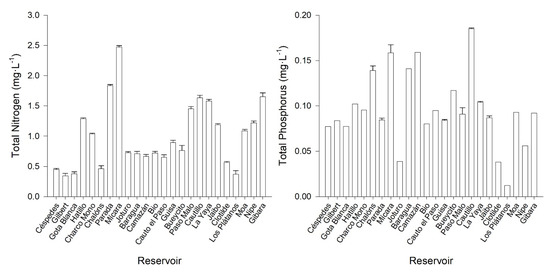 All the reservoirs studied were found to be eutrophic or hypertrophic when the TP or TN concentrations were analyzed. Additionally, all the reservoirs had phytoplankton concentrations higher than 1500 cell·mL−1, which is considered another indicator of eutrophy [27,28,63]. The highest TP concentrations were measured in Hatillo, Camazán, Baragua, Chalóns, Mícara and Cautillo reservoirs (Figure 2), while TN was higher in Mícara and Parada as compared with the other reservoirs.