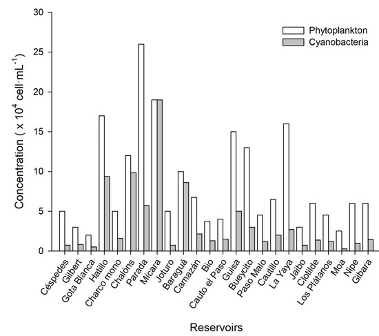 Phytoplankton cell concentration average was 8.4 × 104 cell·mL−1. The highest phytoplankton counting was recorded in Parada reservoir (26 × 104 cell·mL−1), and the lowest in Gota Blanca (2.0 × 104 cell·mL−1). Specifically, the cyanobacteria average concentration was 3.4 × 104 cells·mL−1 with maximum densities in Mícara (19 × 104 cell·mL−1), and the lowest in Moa reservoir (0.28 × 104 cells·mL−1). Chalóns (9.8 × 104 cells·mL−1), Hatillo (9.4 × 104 cells·mL−1) and Baraguá (8.6 × 104 cells·mL−1) reservoirs had concentrations of cyanobacteria cells near the 105 cells·mL−1 (Figure 3).