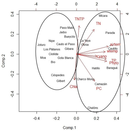 Two groups of reservoirs were highlighted: one is the most influenced by component 1, which included 10 water reservoirs with MC-LR concentrations higher than the WHO limits, except for Charco Mono and Camazán reservoirs (Figure 4). Mícara, Parada, La Yaya and Cautillo were positively influenced by both principal components. The other group of 14 water reservoirs, where MC-LR levels were very low or not detected, showed no influence of component 1 (Figure 4). In this group, Jaibo reservoir is included with an intracellular MC-LR concentration of 1.41 µg·L−1.
