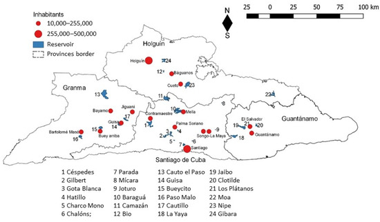 The total catchment area of all reservoirs included in this study is 14,182 km2, which corresponds to 55% of the total area of eastern Cuba (25,700 km2); 19 of the studied reservoirs belong to the three main watersheds of this region [15]: Toa-Mayarí (4), Guantánamo-Guaso (4) and El Cauto (11 reservoirs). The other five reservoirs have their own catchment area (Figure 5).