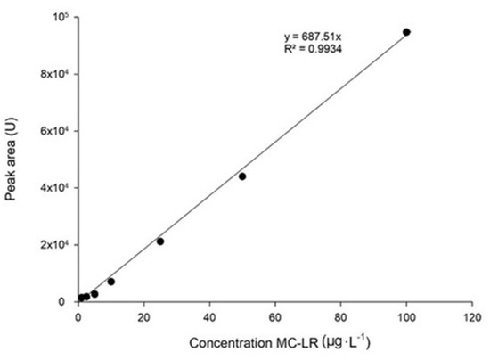 Working standards for the calibration curve to quantified MC-LR were prepared using a stock solution standard from Enzo Life Sciences (5 mg·L−1; ≥95%, HPLC). Serial dilutions were applied to produce standard solutions with concentrations ranging from 1 μg·L−1 to 100 μg·L−1. The calibration curve was based on the peak area in the chromatogram, measured with the software Empower 3.0 against the standard concentrations of microcystin-LR.