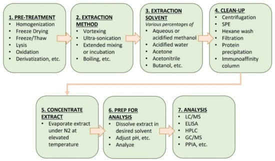 Sample preparation procedures differ according to the toxin analyzed and the nature of the tissue, organ, or biomass analyzed. Typically, this includes extraction, clean-up, and any post-extraction modifications (e.g., derivatization and solvent exchange) prior to analysis. Table 3 lists a variety of sample extraction and preparation procedures from a survey of the literature. The typical workflow being followed is summarized in Figure 1.