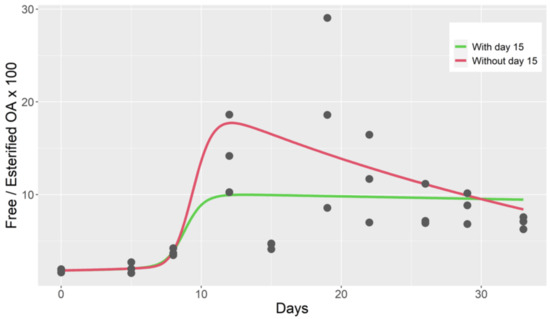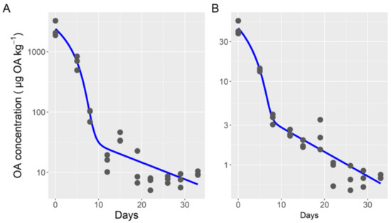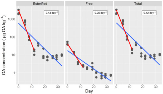 Both esterified and total toxin decreased quickly during the first 12 days of depuration—they were, at day 5, below 30% of the initial level and below 1% at day 12—but the decreasing velocity slowed down during subsequent days. The trend was similar for free toxin, but the transition was softer and the depuration velocity smaller (Figure 1).