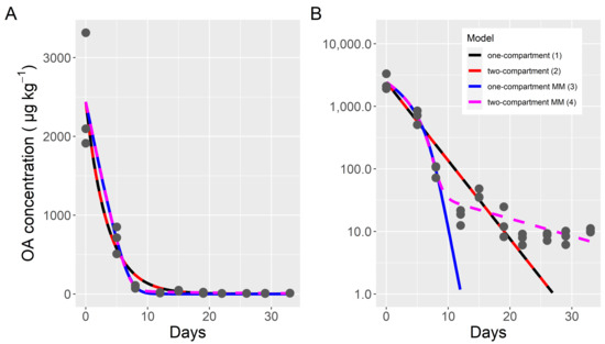 Fitting of four models to the total okadaic acid depuration data of the cockle, in untransformed (A) and logarithmically transformed (B) scale. Dots are the observed data and lines are the outputs of the fitted models. MM indicates that the model used Michaelis-Menten kinetics for the first compartment (models 3 and 4).