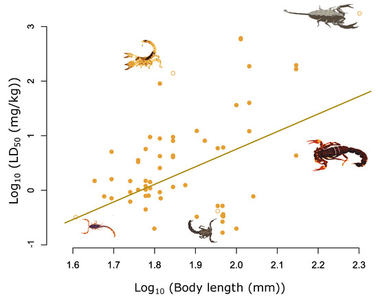 Relationship between log10 total length (mm) and log10 LD50 (mg/kg) for 62 measures of LD50 across 36 species. The fitted line highlights the significant positive relationship between log10 total length and log10 LD50, adjusted for the median chelae ratio value of 3.7 (β = 3.24, pMCMC < 0.001). Selected species highlighted from left to right are highlighted by the hollow yellow circles and are as follows: Scorpion Centruroides noxius; Scorpio maurus; Androctonus crassicauda; Parabuthus transvaalicus; Hadogenes granulatus.