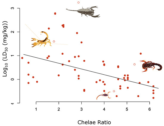 Relationship between chelae and log10 LD50 (mg/kg) for 62 measures of LD50 across 36 species. The fitted line highlights the significant negative relationship between the chelae ratio value and log10 LD50 adjusted for the median log10 total length value of 70 mm (β = −0.26, pMCMC < 0.01). Selected species are highlighted by the hollow red circles and from left to right are as follows: Scorpio maurus; Hadogenes granulatus; Scorpion Centruroides noxius; Parabuthus transvaalicus.
