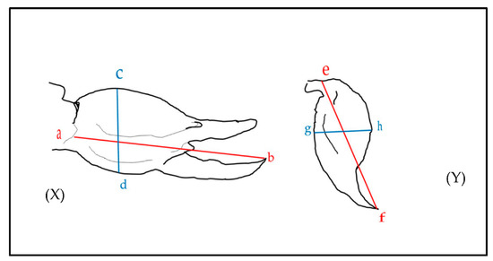 Measurements taken from diagrams and photos with scale bars. (X) shows measurements for the length (a to b) and width (c to d) of the chela. (Y) shows the length (e to f) and width (g to h) of the telson. (a) represents the distal point where the pedipalpal patella meets the tibia; (b) is the most distal point of the pedipalpal tibia; (c) and (d) are the widest dorsoventral points on the pedipalpal tibia; (e) is the posterior end of the venom vesicle; (f) is the distal end of the aculeus; (g,h) are the widest dorsoventral points of the telson.