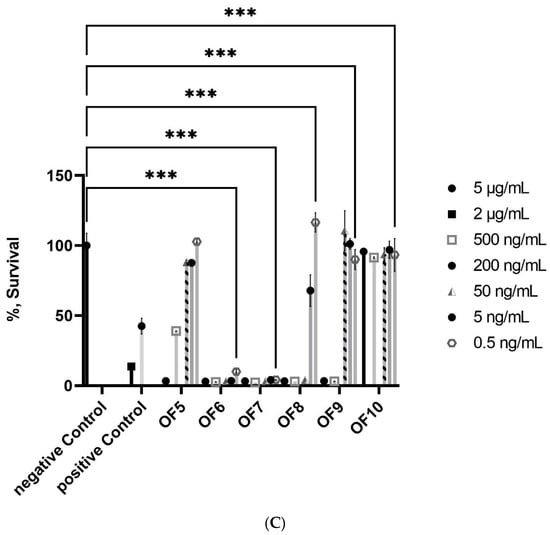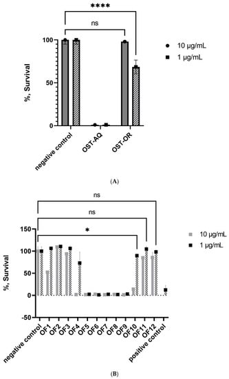 Percent survival of the NCI-H460 cell line as a result of treatment with O. cf. ovata fractions: (A) the aqueous (OST-AQ) and organic (OST-OR) extracts at 1 and 10 µg/mL (B) 1 and 10 µg/mL of the fractions OF1 through OF12, and (C) 5, 2, 0.5, 0.05, 0.005, and 0.0005 µg/mL of the fractions OF5 through OF10. A concentration of 1% DMSO in RPMI 1640 was chosen to serve as a negative control (set to 100% survival) in all calculations to establish consistency by matching the media DMSO composition of all the samples, while 2 µg/mL doxorubicin in RPMI 1640 served as a positive control. Statistical significance values were calculated using 2-way ANOVA function for panels (A) (p < 0.0001 ****) and (B,C) (adjusted p = 0.0001 *** and p < 0.05 *) (in GraphPad 9.3.1 GraphPad Software Inc., San Diego, CA, USA). No statistical significance was signified using ns.