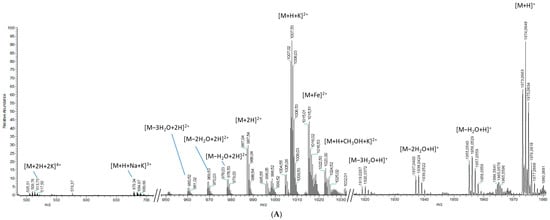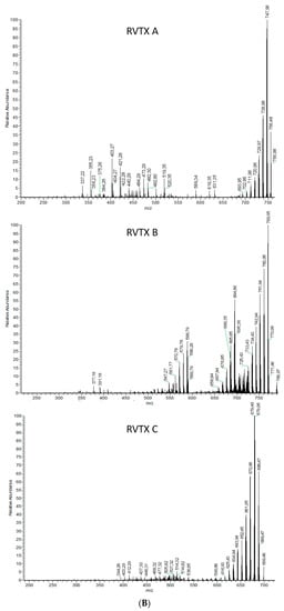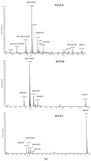 For the three RVTX compounds, the mass spectra also showed a [M+H+K]2+ and a [M+Fe]2+, as well as a [M+2H]2+ for RVTX B and C. Only RVTX A showed neutral ion water losses from its molecular and doubly-charged ions (Figure 4A), detected at m/z 1489.9932, 1471.9838, and m/z 745.500, 736.4957, respectively.