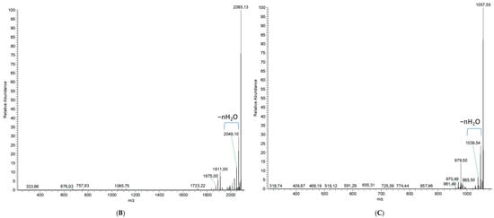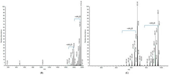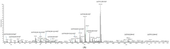 LGTX-B showed four water losses in its doubly-charged ion cluster as well as a [M+H+K]2+ doubly-charged ion at m/z 1052.0698. No such adducts or water losses were detected for LGTX C, except for those deriving from its fragment as described below. LGTX B also showed a triply-charged [M+3H]3+ ion at m/z 695.7119 accompanied by two triply-charged ions resulting from water losses at m/z 689.7093 and 683.7054 (Figure 3A). LGTX C yielded two tetra-charged ions, [M+3H+Na]4+ and [M+3H+K]4+, at m/z 542.0254 and 546.0198, respectively (Figure 3A).