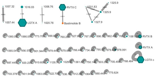 A Global Natural Products Social (GNPS) MS2-based molecular network was built from all six fractions along with compounds from a standard library of cyanobacteria compounds available on the GNPS platform (Figure 5). However, none of the isolated compounds matched with already known compounds, except RVTX C. This latter compound clustered with the polyhydroxy-macrolide bastimolide B with a cosine score of 0.76.