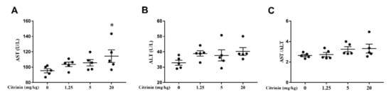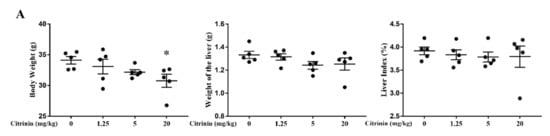 Chicago/Turabian StyleWu, Dongyi, Chenglin Yang, Mengran Yang, You Wu, Yan Mao, Xinyan Zhou, Ji Wang, Zhihang Yuan, and Jing Wu. 2022. "Citrinin-Induced Hepatotoxicity in Mice Is Regulated by the Ca2+/Endoplasmic Reticulum Stress Signaling Pathway" Toxins 14, no. 4: 259. https://doi.org/10.3390/toxins14040259