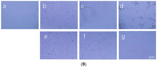 Cytotoxicity assay. (A) The histogram shows the cell survival rate at different PLTX concentrations, and the cell survival rate was detected by the CCK-8 method. All experiments were repeated at least three times, and the cell survival rate decreased with increasing PLTX concentration. The values are presented as the means ± SEM. ** p < 0.01 vs. the control group. (B) Cells were treated with different concentrations of PLTX (a–g: 0, 2 × 10−10, 2 × 10−9, 2 × 10−8, 2 × 10−7, 2 × 10−6, 2 × 10−5 M) for 24 h. A 20× magnification objective was used. Scale bar: 100 µm. Representative images of three independent experiments are presented.