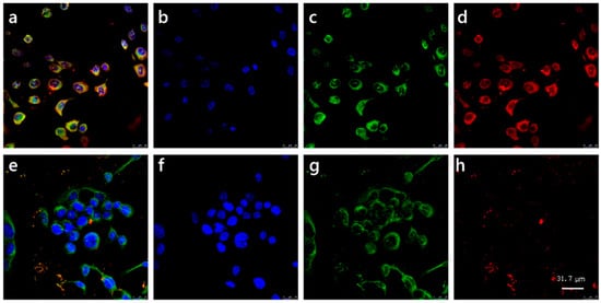 Immunolocalization of PLTX in HaCaT cells. Cells were exposed to 2 × 10−8 M PLTX. PLTX is shown in red by 5′-Cy5-labeled aptamer (red fluorescence). The nuclei are shown in blue by DAPI (blue fluorescence). The cell membrane is shown in green by DiO (green fluorescence). A 63× magnification objective was used. Scale bar: 31.7 µm. The top panel was treated with specific aptamer to show the subcellular distribution of PLTX. The bottom panel shows controls with random aptamer. (a,e) Co-localization of the nucleus, cell membrane and PLTX. (b,f) The nucleus only. (c,g) The cell membrane only. (d,h) Distribution of PLTX labeled by different aptamers in cells: PLTX-specific aptamer (d) and random aptamer (h). Representative images of three independent experiments are presented.