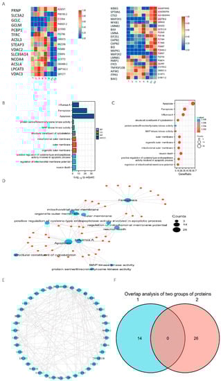 GO and KEGG enrichment analysis showed that proteins in “Ferroptosis” and “Apoptosis” were significantly altered in the PLTX-treated group compared with the control group (Figure 3B,C). Figure 3D shows the connection between each pathway. The larger the point is, the more proteins were enriched in this pathway.