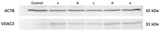 To verify whether PLTX really promotes ferroptosis in cells, we selected the expression products of VDAC3 for verification. VDVC3, a member of the eukaryotic mitochondrial pore protein family, forms a channel through the outer membrane of mitochondria that allows the diffusion of small hydrophilic molecules. VDAC3 regulates various cellular processes by regulating molecular exchange between cell compartments. It can regulate the permeability of the mitochondrial outer membrane and induce ferroptosis. After treatment with PLTX for 24 h, we extracted the protein and checked its expression level by western blot. Compared to the reference protein, ACTB, the expression level of VDAC3 in PLTX-treated cells was significantly increased (Figure 4). This is consistent with our proteomic results shown above.