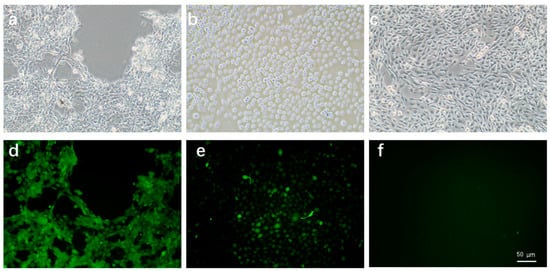 Effect of PLTX treatment on intracellular ROS levels. (a,d) Treated with 2 × 10−8 M PLTX. (b,e) Positive control treated with 50 μg/mL Rosup. (c,f) Negative controls untreated with Rosup. Here, (a–c) are bright field images and (d–f) are fluorescence images. A 40× magnification objective was used. Scale bar: 50 µm. Representative images of three independent experiments are presented.