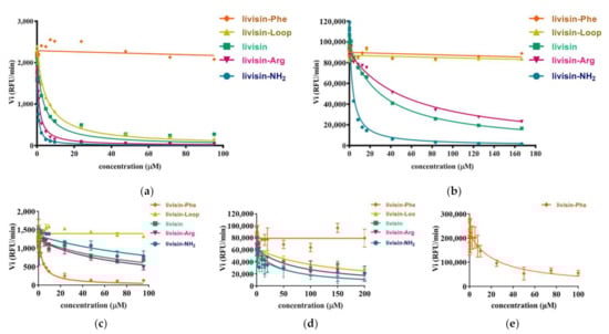 Inhibitory effects of livisin and its modified forms on the activities of various serine proteases. (a) Bovine trypsin; (b) matriptase; (c) chymotrypsin; (d) mesotrypsin; (e) human proteasome 20s. The activity of each protease was assayed in the presence of each peptide ranging from 0.1 μM to 100 μM in PBS (pH 7.4) and the corresponding substrate: Z-Gly-Gly-Arg-NHMec (trypsin); Suc-Ala-Ala-Pro-Phe-NHMec (chymotrypsin); Boc-Gln-Ala-Arg-AMC (matriptase); Mca-Arg-Pro-Val-Glu-Nval-Trp-Arg-Lys(Dnp)-NH2 (mesotrypsin); Suc-Leu-Leu-Val-Tyr-AMC (human proteasome 20s).