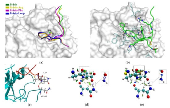 Molecular docking of livisin and its analogs and bovine trypsin. (a) Comparative docking result of livisin analogs and trypsin. Livisin, livisin-Arg, livisin-Phe, and livisin-loop are shown in green, yellow, pink, and blue color and are represented by cartoons. P1 residues of these peptides are represented by sticks and are inserted into the trypsin S1 pocket. (b) Detailed polar interactions between livisin and trypsin. Trypsin is shown as the surface and livisin is represented by the cartoon in green color with the disulfide bond in yellow. The residues in livisin and trypsin that have polar interactions are represented by sticks with green and cyan colors, respectively, and the interactions are rendered in red dots. The oxygen, nitrogen, and hydrogen atoms are shown as red, blue, and white in livisin. (c) Interactions between the L17 of livisin-NH2 and tN102 of trypsin (stick representation); livisin-NH2 is shown in a red cartoon. (d,e) Three-dimensional maps of intermolecular and intramolecular interactions around C16 and L17 of livisin (d), livisin-NH2 (e) (top), and tN102 (bottom) of trypsin, as demonstrated by the noncovalent interaction (NCI) analysis []; the main differences are framed.