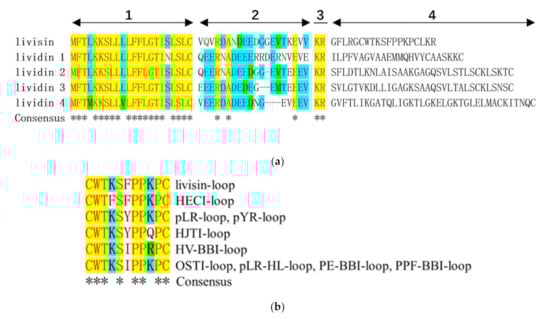 Alignment of livisin amino acid sequences. (a) Alignment of livisin precursor and lividin precursors (the variable mature peptides are not aligned). The domains of the precursors are indicated: (1) signal peptide region, (2) acidic spacer peptide region, (3) KR endoproteolytic processing site, (4) hyper mutable functional peptide region. (b) Alignment of the conventional inhibitory loop of the identified natural BBI-like peptides. Consensus residues are labeled in red letters with yellow background and indicated by asterisks. Conservative residues are highlighted by the light blue background, and similar residues are indicated by green background. Alignment was prepared using the ClustalW algorithm in MEGA11 [] and colored.