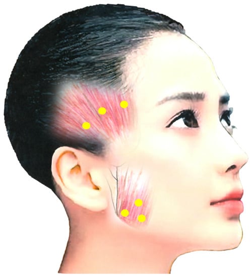 After careful examination including EMG, occlusal force and palpation, BoNT is often injected into the temporalis muscle at the same time. This muscle, particularly anterior fibers, elevates the mandible, and pulls it back with posterior fibers. Notably, 10–50 units of BoNT are injected 10–15 mm deep at three sites (Figure 1) [4,173].