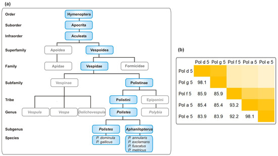 Allergy-relevant Polistes species and their relationship. (a) Taxonomy of Polistes species currently listed in the WHO/IUIS Allergen nomenclature database As the taxonomy of the order Hymenoptera is highly complex, only a selection of allergy-relevant taxa is shown. (b) Percentage of identity on protein level between antigen five allergens from allergy-relevant Polistes species. The color code ranges from light (low identity) to dark yellow (high identity). Sequence identifiers: Pol d 5: P81656; Pol g 5: P83377; Pol a 5: Q05109; Pol e 5: P35759; Pol f 5: P35780.