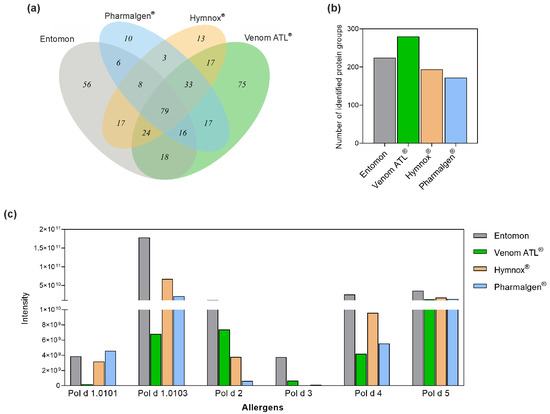 The LC-MS/MS analyses were only performed for Pharmalgen®, Venom ATL®, Hymnox®, and the reference venom from Entomon as no genomes matching the peptides of the aforementioned American species have been published. Figure 2a shows a Venn diagram of the protein groups identified by mass spectrometry in these products. All products share a cut set of 79 protein groups, which also includes the annotated allergens from P. dominula [31,32]. The capillary-extracted venom shows 56 product-specific protein groups, Pharmalgen® 10, Hymnox® 13, and Venom ATL® 75.