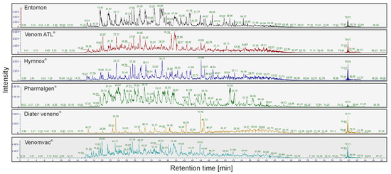 LC-MS was used to confirm the results from the SDS-PAGEs of the first batches, in particular of Diater veneno® (Figure 4). While the intensity and richness of the peaks were comparable for Entomon, Pharmalgen®, Venom ATL®, Venomvac®, and Hymnox®, the analyzed product of Diater showed a different picture, i.e., fewer and less pronounced peaks. This suggests that the first batch of Diater veneno® tested contained hardly any analyzable protein.