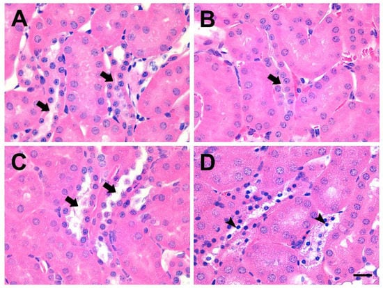 This demonstrated a cytotoxic effect of GFP-Etx on these cells. Conversely, no alterations were observed in the kidneys of animals injected with GFP-Etx-H106P, GFP-Etx-ΔV108-F135, or GFP-Etx-ΔS188-F196 (arrows, Figure 1A–C, respectively).