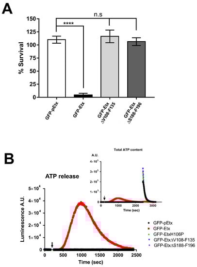 The pore-forming capacity of Etx can be quantified by measuring the amount of ATP released from the cytosol or internal cell stores [,,]. To quantify the amount of ATP released, luciferin-luciferase assays were performed. MDCK cells were incubated with GFP-Etx-ΔV108-F135 (blue line, Figure 2B) or GFP-Etx-ΔS188-F196 (purple line, Figure 2B), and their effects were compared to those of the non-toxic GFP-Etx-H106P (green line, Figure 2B) and GFP-pEtx (black line, Figure 2B) used as negative controls, as well as to those of GFP-Etx (red line, Figure 2B) used as the positive control. No ATP release was observed with any of the GFP-Etx mutants. As expected, all the ATP was released following GFP-Etx exposure and no residual ATP was measured after cell permeabilization with Triton X-100 at the end of the experiment (insert, red line, Figure 2B). However, all the ATP content was detected in the cells treated with GFP-pEtx, GFP-Etx-H106P, GFP-Etx-ΔV108-F135, or GFP-Etx-ΔS188-F196 after cell permeabilization with Triton X-100 (insert, black, green, blue and purple lines, respectively, Figure 2B).