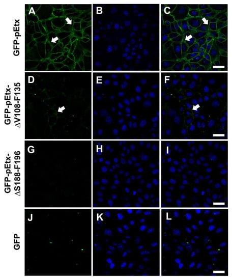 GFP-pEtx is a useful tool to study the binding properties of Etx [,,] together with the non-toxic mutant GFP-pEtx-H106P, which also shows the same binding pattern as wild-type Etx []. To study the binding of the new mutants, MDCK cells were incubated with GFP-pEtx-ΔV108-F135 or GFP-pEtx-ΔS188-F196 and compared to those incubated with GFP-pEtx. While GFP-pEtx-ΔV108-F135 showed a clearly reduced binding to the MDCK plasma membrane compared with GFP-pEtx (Figure 3D–F), GFP-pEtx-ΔS188-F196 did not show any binding to the MDCK plasma membrane (Figure 3G–I).