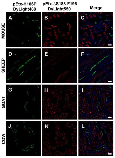 Taking advantage of this result and in order to stain the proximal and distal tubules at the same time, the Etx mutants pEtx-H106P and pEtx-ΔS188-F196 were labeled with DyLight Fluor 488 and 550, respectively, as explained in the Materials and Methods section. In all the species tested, pEtx-H106P-DyLight488 recognized the distal tubules (green, Figure 6A,D,G,J), while pEtx-ΔS188-F196-DyLight550 recognized the proximal tubules (red, Figure 6B,E,H,K).