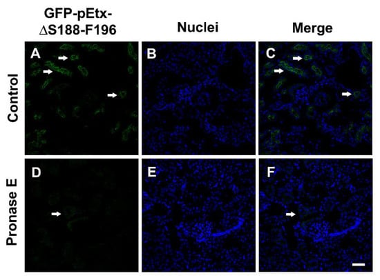 Mouse kidney sections were incubated with pronase E (Figure 7) to enzymatically remove a wide range of proteins that could be involved in the binding of GFP-pEtx-ΔS188. In this case, the binding of GFP-pEtx-ΔS188-F196 to the epithelial cells from the proximal tubules of the kidneys was clearly decreased compared to the control untreated kidney slice (arrows in Figure 7D,F).