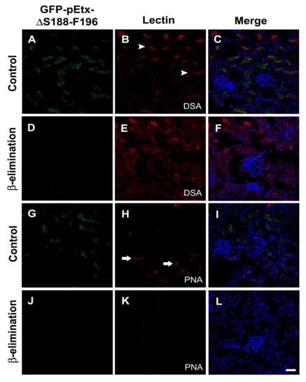 Effect of β-elimination on the binding of GFP-pEtx-ΔS188-F196 to the proximal tubules. Confocal images of mouse kidney sections pre-treated with 0.055 N NaOH for 1 h at 37 °C (β-elimination) or without NaOH in the same conditions (control). Sections were co-incubated with GFP-pEtx-ΔS188-F196 (green, (A,C,D,F,G,I,J,L)) and the lectins DSA (red, (B,C,E,F)) or PNA (red, (H,I,K,L)). Note the usual DSA staining of mainly the proximal tubules (arrowheads in (B)), which increased notably after treatment (red, (E)). The PNA lectin shows staining mainly of the distal tubules (arrows in (H)), which decreased notably after treatment (red, (K)). The binding of GFP-pEtx-ΔS188-F196 to the proximal tubules diminished after treatment (D,F,J,L) compared to the usual staining without NaOH treatment (A,C,G,I). Nuclei were stained with TO-PRO-3 (blue). Scale bar, 40 µm.