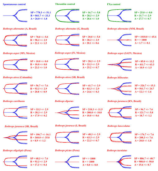 Thromboelastography traces showing the action of Bothrops venoms (red traces) on human plasma. A total of 18 representatives (red traces) of the 37 venoms examined (Table 1) are overlaid on top of the spontaneous control (blue traces) and ordered in the figure alphabetically. Three controls were performed: a negative control (spontaneous clotting time of plasma, blue traces), and two positive controls (thrombin control and FXa control, green traces). Three clotting parameters are shown: SP (split point—time until tracing splits, representing start of clotting), R (reaction time—time until amplitude = 2 mm, representing time until detectable clot), and A (Amplitude—width of tracing at latest time point, representing clot strength at latest time point). All values are mean ± standard deviation (n = 3). Each test lasted 1800 s, so > 1800 s indicates that the parameter was not recorded in this time. The spontaneous clotting control of human plasma (negative control) had an SP of 778.3 ± 51.1 s, R of 861.7 ± 33.3 s, and A of 26.0 ± 1.8 mm. Locality details for locality abbreviations used in this figure can be found in Table 1.